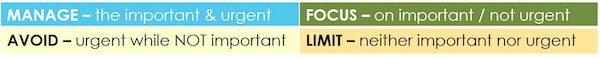 The key to remember is that although “not urgent” TODAY – if you don’t focus on the things you place into this category -> eventually, they will become urgent.