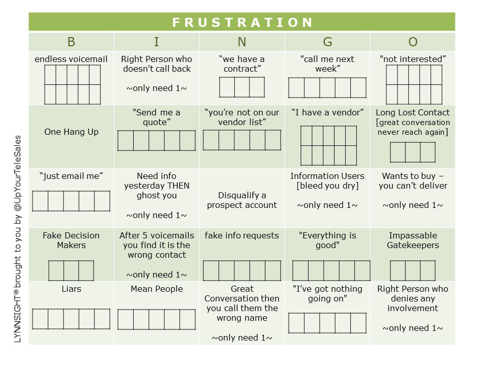Frustration Bingo is a game I invented when having a horrible week as an inside salesperson. I decided, instead of getting upset about my current lack of progress, I would truly turn it into a game.