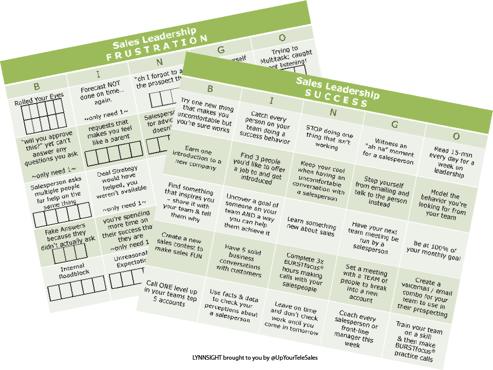 Get your copy of my Frustration and Success Bingo – Leadership Versions, grab the other salesleaders in your organization or accountability partners and be the first to shout B-I-N-G-O!